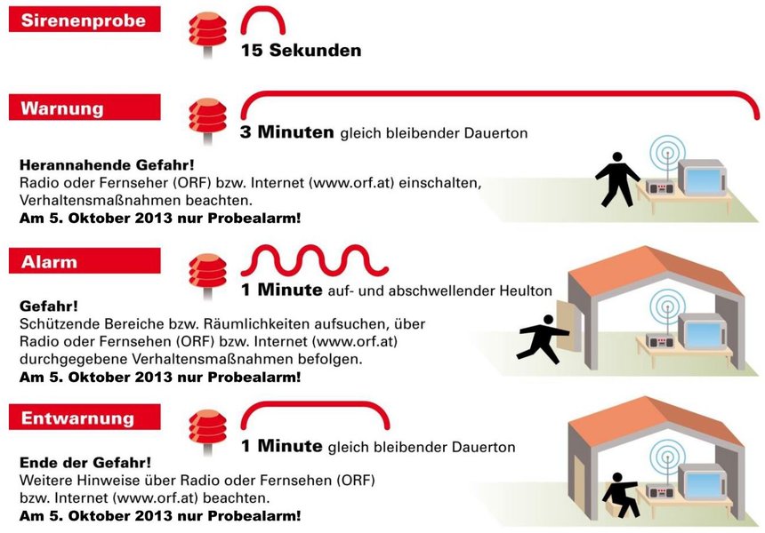 Radio oder Fernseher (ORF) bzw. Internet (www.ORF.at) einschalten, Verhaltensmaßnahmen beachten. - Alarm