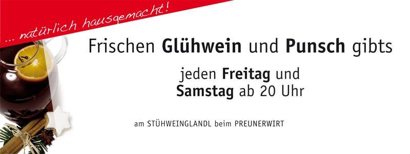 Auch beim Preuner Wirt werden während der Adventwochenenden beim "Stühweinglandl" heiße Getränke und leckere Kleinigkeiten ausgeschenkt. Vorbei schauen lohnt sich! Jeden Freitag und Samstag im Advent ab 20 Uhr (6., 7., 13., 14., 20. und 21. Dezember).