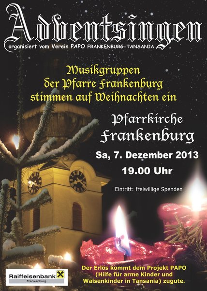 In der Pfarrkirche wird am Samstag für einen guten Zweck gesungen: Ab 19 Uhr stimmen verschiedene Gruppen aus und rund um Frankenburg musikalisch auf den Advent ein. Eintritt: Freiwillige Spende für das Projekt PAPO - Frankenburg Tansania.