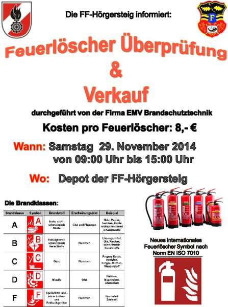 Am Samstag, 29. September werden von 9 bis 15 Uhr beim Depot der FF Hörgersteig Feuerlöscher um 8 EUR fachmännisch überprüft. Feuerlöscher müssen alle 2 Jahre auf ihre Funktion überprüft werden.