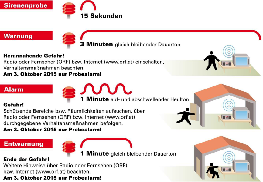 In diesem Falle Radioprogramme, die Fernsehsender oder die Website des ORF aufrufen und Verhaltensmaßnahmen befolgen. - Alarm: 1 Minute auf- und abschwellender Ton