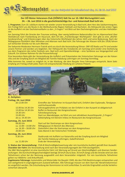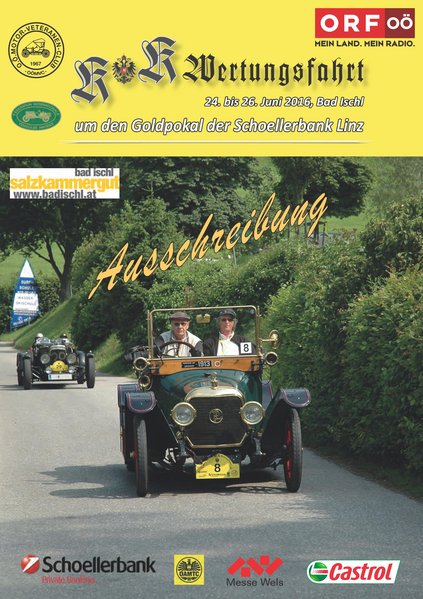 Die Kaiserstadt ist 2016 erneut Start- und Zielort der K&K-Wertungsfahrt, die in zwei Etappen unter anderem durch Bad Aussee, Hallstatt, Seewalchen oder Vöcklabruck führt – und damit durch das Salzkammergut, in dem Tradition und Werte seit Jahrzehnten hochgehalten werden. Nicht nur in Bad Ischl, wo ein Operettenstück des Lehàr-Festivals und ein Empfang in der Kaiservilla am Programm stehen, sondern auch in Frankenburg, wo eine „Würfelspiel-Sonderprüfung“ auf die historischen Ereignisse der Bauernkriege rund um das Frankenburger Würfelspiel Bezug nimmt. „Wir suchen bewusst Anknüpfungspunkte etwa zu Musik und Geschichte, da es perfekt zu unserer Veranstaltung passt, immerhin ist ja auch das Auto ein wichtiges Kulturgut unserer Gesellschaft. Unsere Teilnehmer identifizieren sich in hohem Maß mit Traditionen und unterstreichen das beispielsweise durch das Tragen authentischer Kleidung passend zu der Blütezeit ihrer Fahrzeuge“, sagen gleichermaßen KR DI Gerhard Weiß und der Organisator dieser Jubiläumsveranstaltung Mag. Helmfried Thalhammer.