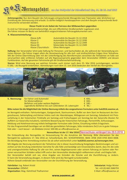 Der Gewinner der 10. K&K-Wertungsfahrt, der den Goldpokal der Schoellerbank Linz erhält, wird im Rahmen von Gleichmäßigkeitswertungen ermittelt, bei der die Einhaltung von Durchschnittsgeschwindigkeiten und Richtzeiten sowie Geschicklichkeit entscheidend sind. Bis zu 70 Teilnehmer werden bei der internationalen Veranstaltung erwartet. „Die Erhaltung historisch wertvoller Fahrzeuge setzt viel Leidenschaft voraus. Umso größer ist die Freude, wenn Gleichgesinnte drei erlebnisreiche Tage miteinander verbringen. Unser Ziel muss es sein, auch die Jugend heranzuführen, denn ansonsten stirbt dieses Hobby aus“, hofft Weiß, 2016 neue Teilnehmer im elitären Starterfeld begrüßen zu dürfen.