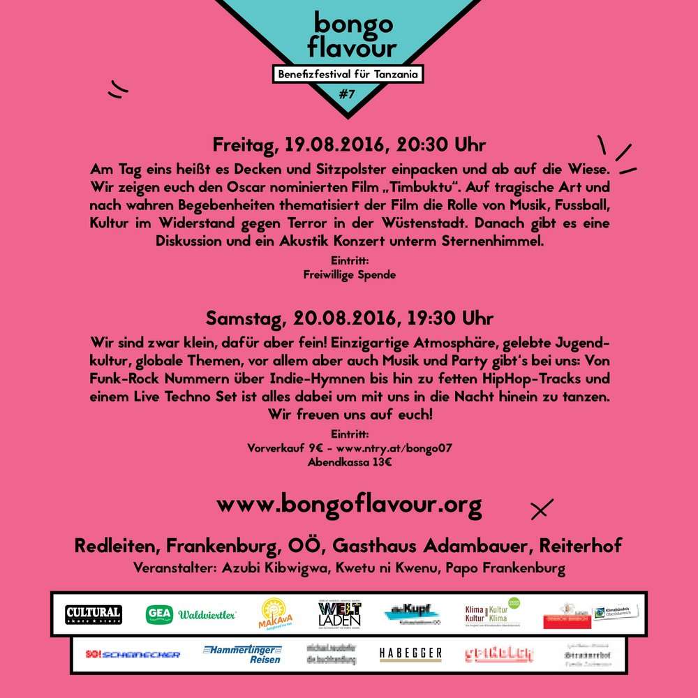Im Rahmenprogramm werden Bilder tansanischer Künstler ausgestellt, der Maler Atakalo Soko wird persönlich anwesend sein. Für Essen und Trinken aus der österreichischen und tansanischen Küche ist bestens gesorgt.
