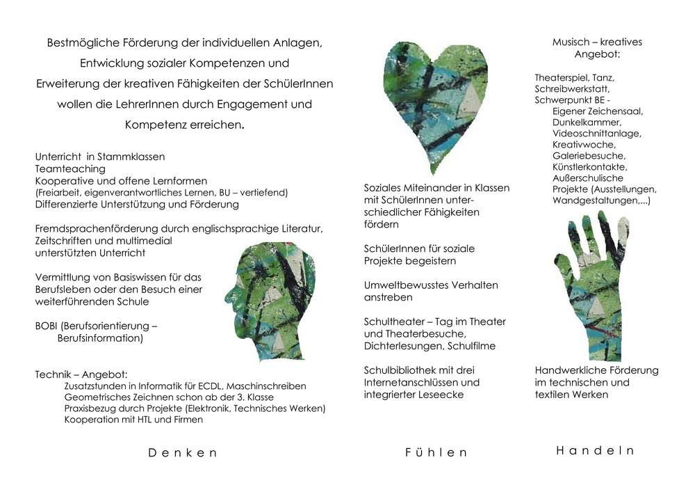 Das musisch-kreative Angebot umfasst Theater, Tanz und Literatur. Aus der „Zeichenhauptschule“ ist ein ganzes Bündel an bildnerischen Ausdrucksformen entstanden, ergänzt durch Foto- und Videobearbeitung sowie mit Projekten mit Künstlern, mit Galeriebesuchen und eigenen Ausstellungen.