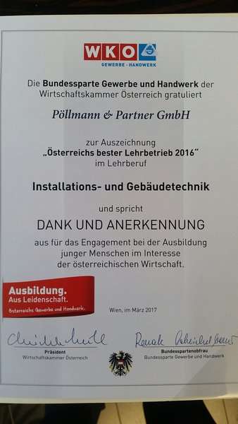 Pöllmann & Partner steht bekanntermaßen für Qualität. Dies beweist der Betrieb auch wenn es um seine Lehrlinge geht. Nicht nur die Auszeichnung "Österreichs bester Lehrbetrieb 2016" wurde nach Frankenburg geholt, auch Florian Kaiser wurde zum besten Installateur Lehrling 2016 gekürt.