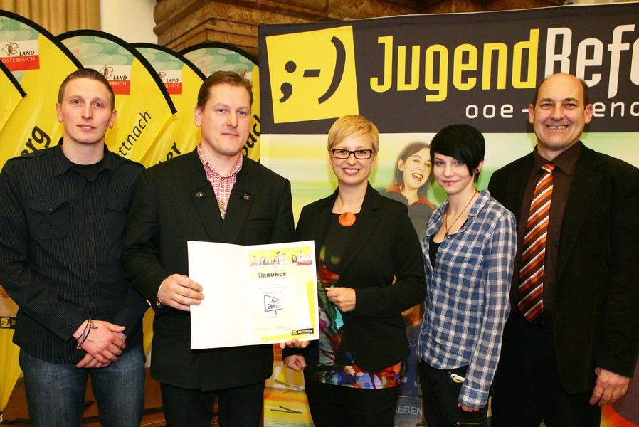 V.l.n.r: Jugendtreffleiter Josef Seiringer, Jugendausschussleiter Hannes Piras, Jugendlandesrätin Mag.a Doris Hummer, Jugendtreffmitarbeiterin Magdalena Raab, Vizebgm. Kons. Johann Baumann