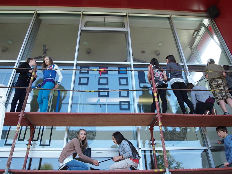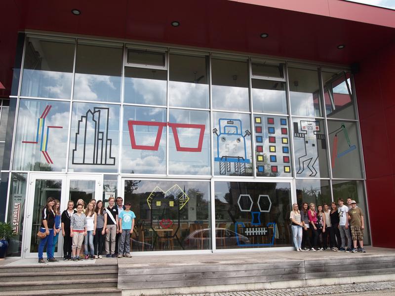 Es ist gelungen, im Schwerpunkt „Bildnerisches Gestalten“ für die 4. B noch ein großes Projekt als Abschlussarbeit zu organisieren. Die SchülerInnen gestalteten am Montag, den 1.Juli, die Glasfassade des Restaurants „Schurli“ in Ampflwang mit TAPE ART. Material und Ausstellungsfläche wurden von der Fa. Spindler zur Verfügung gestellt.